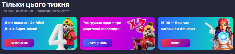 | Первый депозит | 100-150%, минимум 150 грн, максимум 30,000 грн |